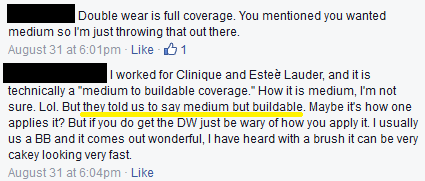 I’m part of a beauty group on Facebook and one member said she was looking for a medium coverage foundation, and asked what everyone thought of Double Wear.