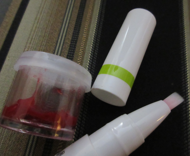 This is a very big issue for someone on-the-go to deal with a cap full of blush stain. Where should they put the excess product? That style of brush is good for packing on color, which isn’t what most would want to do with a stain. So the packaging is a fail but the actual gel was worth saving for me. So I took one of my sample jars and clicked out all the remaining product.