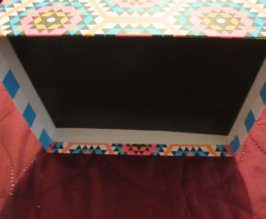 Now we’re moving onto the lid. In my example, I followed the pattern of the print but you can use a ruler and pencil to trace a rectangle underneath the lid and then cut it out to form a hole in the cover.