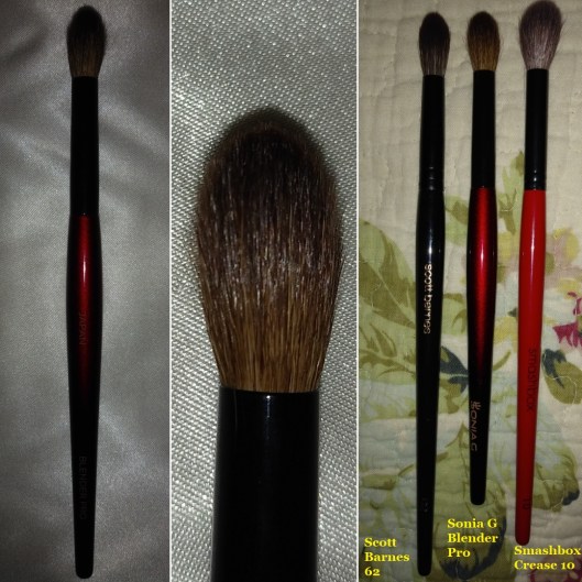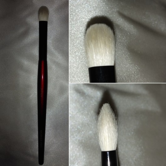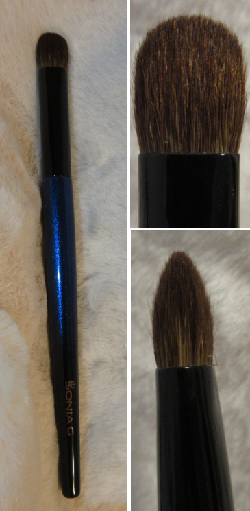 This brush is available in a variety of fibers: goat, horse, goat/horse mixture, blue squirrel, and synthetic. This brush is commonly touted as the equivalent of the MAC 217, Wayne Goss 18, and Sonia G Worker Pro. I don’t use this brush that often, as I feel more comfortable using my cheaper brushes with this head shape (until the Sonia G Builder Three). Though the shape is more beneficial for packing/patting, I sometimes use this to apply a wash of color above the crease or blow out one shade.