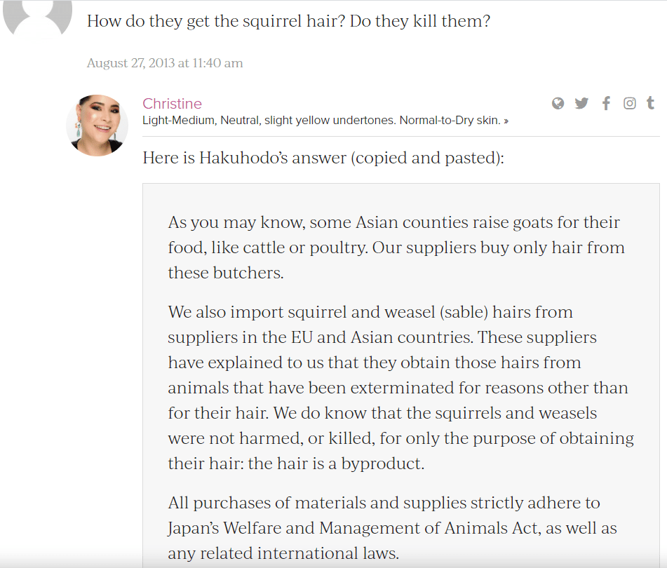While combing/brushing, sheering, and cutting hair is cruelty-free, if the animal was killed for their meat or as pest/population control in a region, the procured hairs are considered a by-product of the industry, which allows them to also be labeled cruelty-free. Meaning, if the animal was not killed specifically for its fur, it is considered cruelty free. I don’t remember all my sources, as some of my research was done in 2017, but I came across this comment from Temptalia where Hakuhodo mentions that even goat hair is obtained from “butchers.” This further supports my belief that most cruelty-free natural hair fibers are not obtained from brushing or sheering. The majority are sourced when the animal is no longer alive.