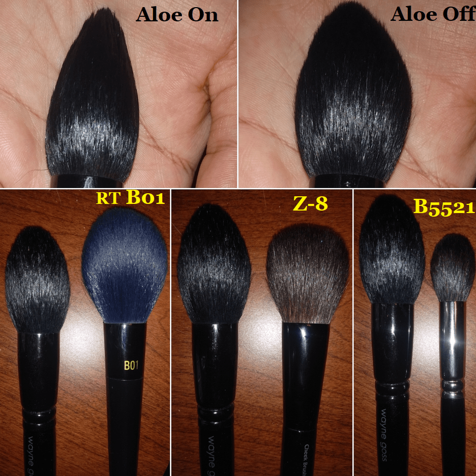 I purchased mine from a Third Party Seller. My brush doesn’t completely match the specifications on the site, as is normal with older brushes when hair is more abundant than other years, so I used Temptalia’s measurements based on her original review, which does match mine. When I received this brush it was considerably puffed out, which I reshaped later. I use 99% aloe vera gel (I couldn’t get 100% at the time) to shape them after being wet. I learned the trick from Tarababyz. It’s great because brush guards are only really meant for specific brush shapes. The brush guard didn’t work well enough on this brush and I felt it needed to be reconditioned anyway (I use facial oil or almond or sunflower seed oil mixed with a good cleanser) so I rewashed it using my reconditioning method, then added a small amount of aloe vera gel just on the outsides. Then I cracked it loose of the gel the next day and it was perfect! I’ve been using this method for several years and have not had any issues with it, though I would always say use caution when trying out new tricks. If you want to test it, try it on a brush you like the least.