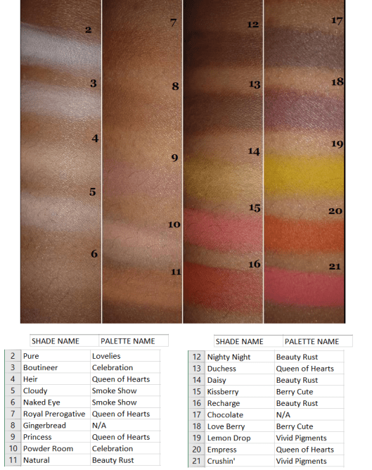 There was a time when I purchased Coloured Raine shadows to make quads as Christmas gifts. Your Majesty (which I somehow had three backups in my collection) and Malibu from this set of swatches were among them. I should note that I did take Super Star out of my collection since it was so similar to Rosé. I parted with Nightingale as it is too common of a color. Paradise Isle looks like a more sparkly version of Unexpected, yet I couldn’t part with either shade. I was also surprised to discover the Blue Magic shade I’ve purchased for others, I didn’t have in my own collection. I kept seeing Opulence and assumed it was Blue Magic. In the pan, Opulence has a purple tinge that doesn’t translate to the eye, as the purple disappears once it’s rubbed onto the skin. Since I’m just left with bright blue on my skin, I wonder if I’m still missing out by not having the Blue Magic shade. It looks like it might just be a darker version. If I get it in the future, I will update this post as usual.