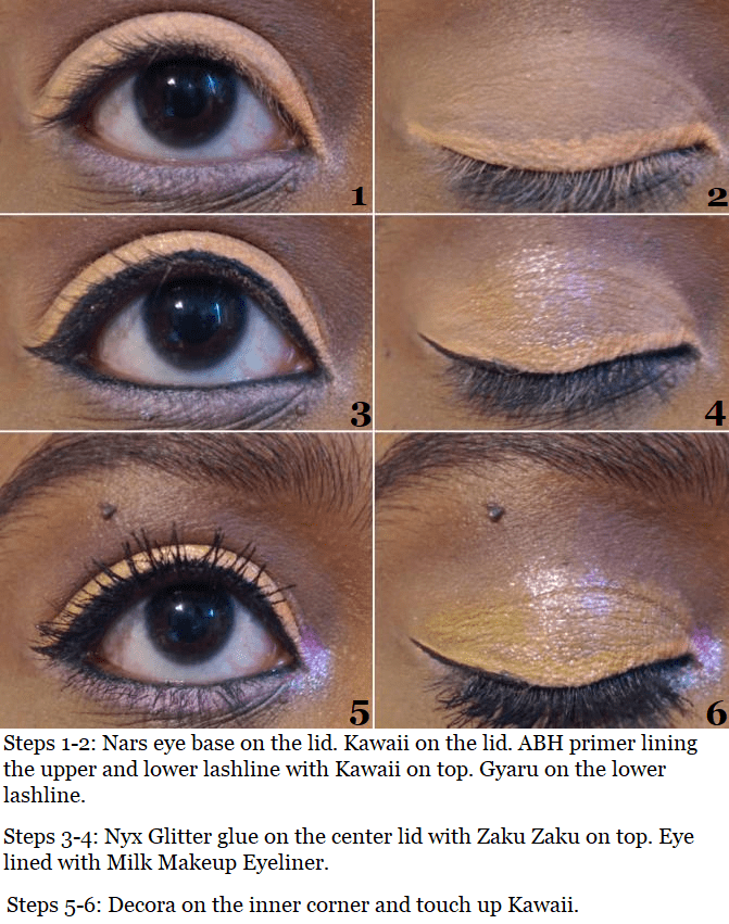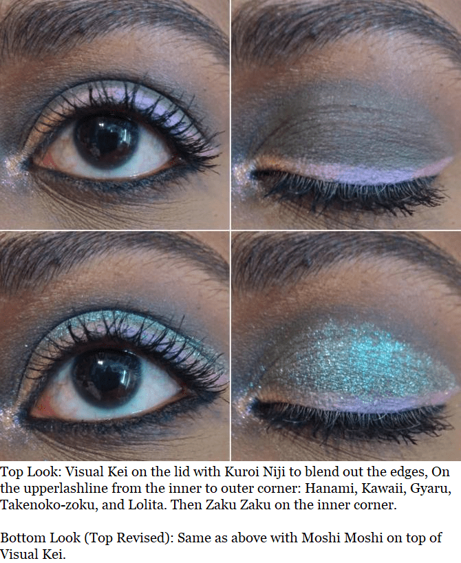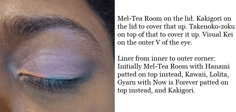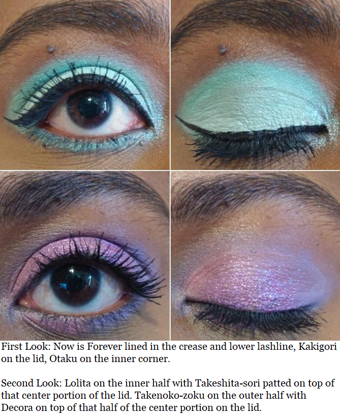 The base in Decora is the most pigmented, and therefore is the darkest one, especially with its darker purple glitter. That’s why I often pair it with Takenoko-zoku over Lolita or Gyaru when one of those two are on the other half of my eyes. Takeshita-dori looks darker in the pan, but the light purple glitter makes it appear lighter than Decora. The vibrant yellow in Zaku Zaku doesn’t translate to the eye and appears more of a peachy pink, which is why I pair it most often with Kawaii. Moshi Moshi looks mostly green with blue glitter. Otaku looks pink in the pan, but it just looks blue on me.
