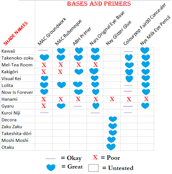 These are the results of my testing, which I hope better explains what I was trying to say. The difference between the lilac line and blue hearts is that some of the bases had the color show up but the shadows faded quickly. And even though the Nyx Jumbo Eye Pencil worked the best of all, there’s still a learning curve to using this too.