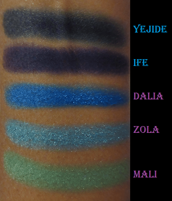 The shade names in green are from the Tribe palette, which has been discontinued. Blue is for the Magic palette, Purple for Masquerade, and lilac purple for the Violets.