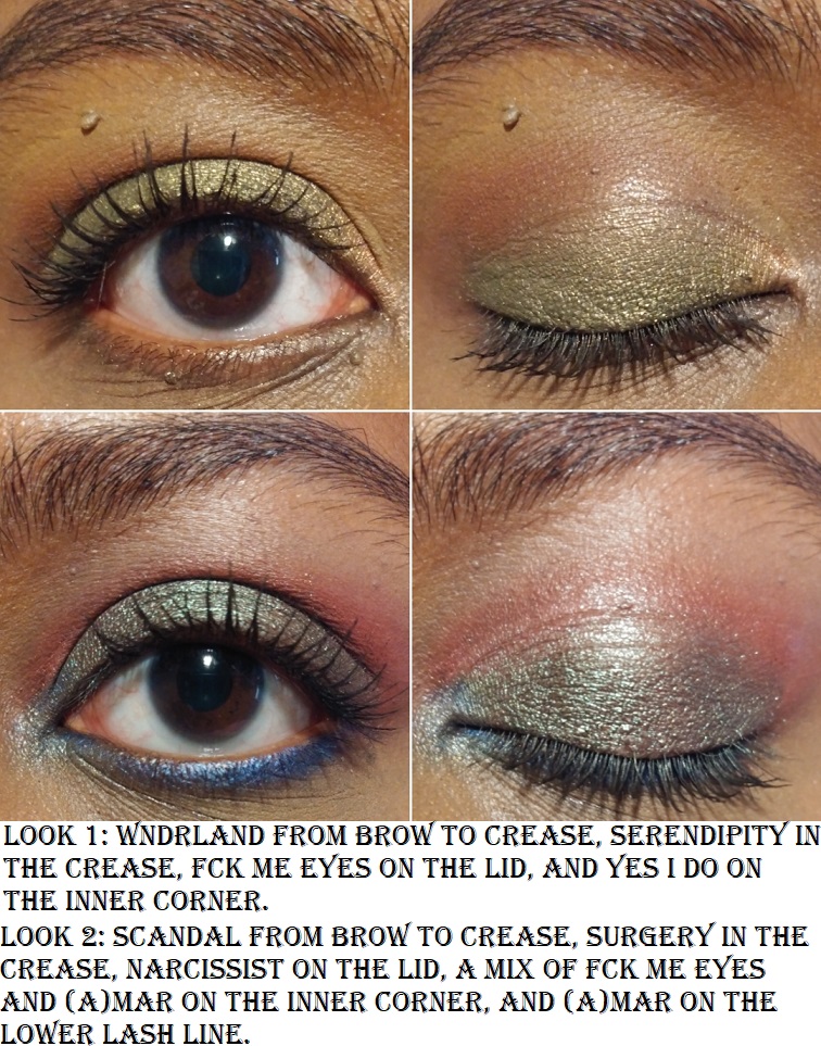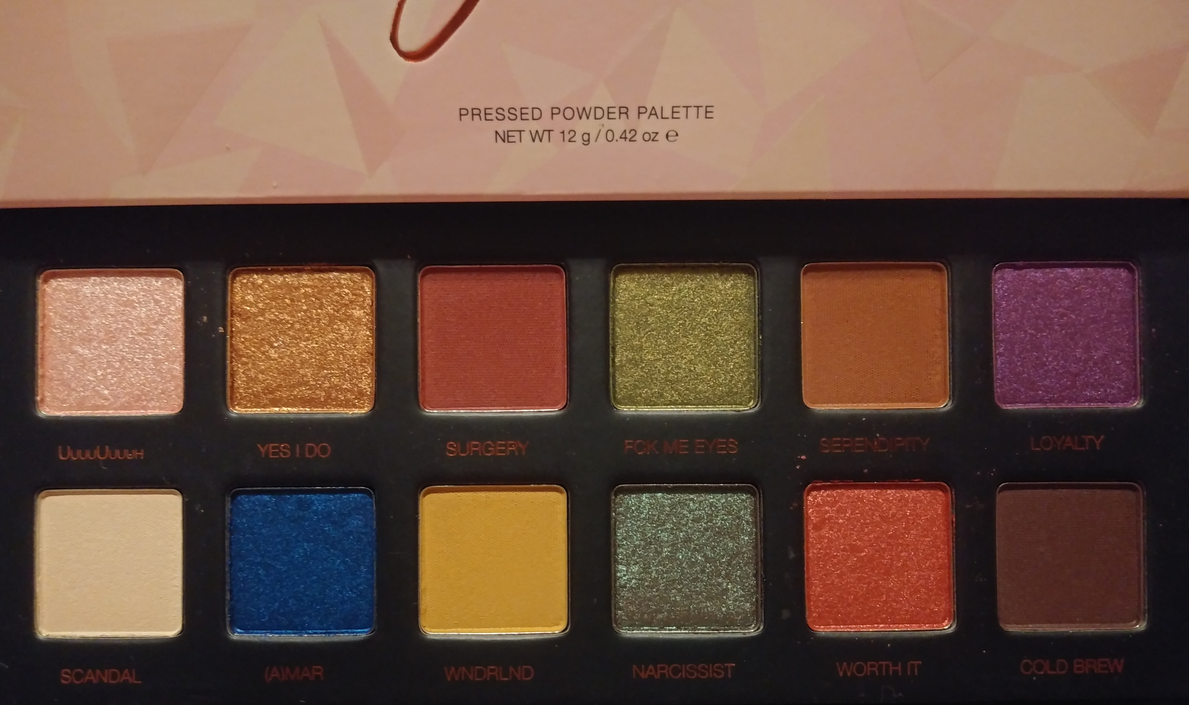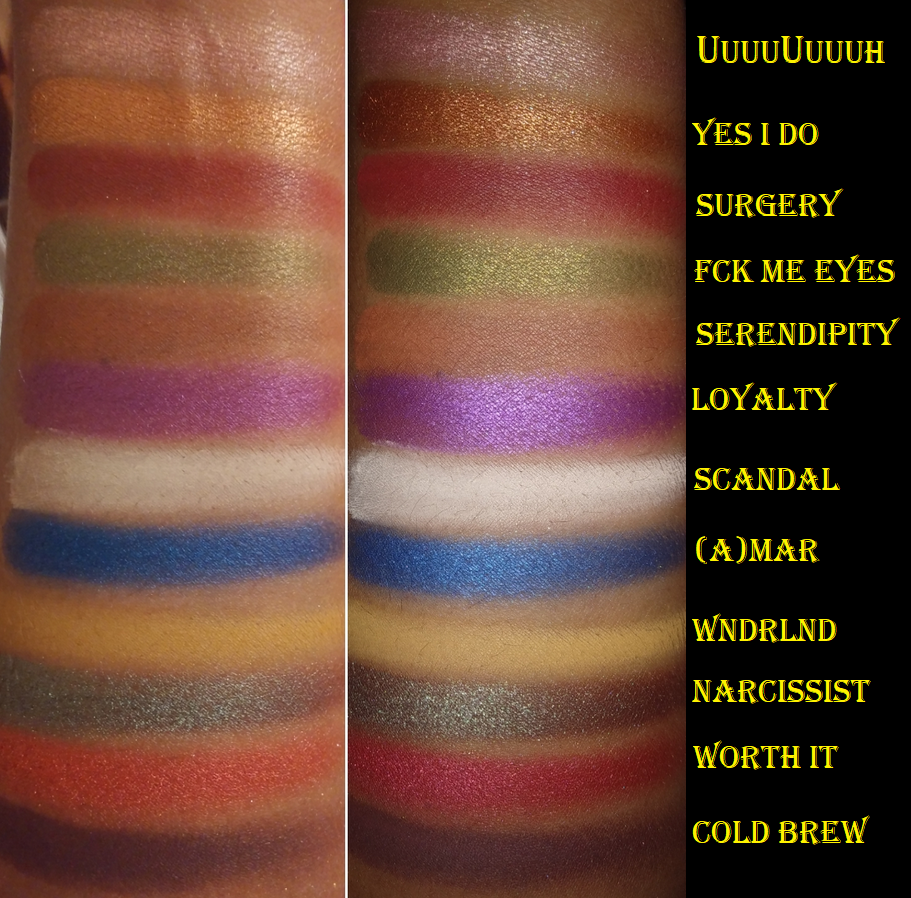 I love the fact that these shimmer shades make beautiful new colors when mixed together. For example, Fck Me Eyes and (A)mar create a pretty turquoise blue. Loyalty is a red-based purple but when combined with (A)mar is makes a nice deep cool purple. For a white shade, Scandal is not stark on my skin tone and I can actually use it in the crease. This is probably the only white shade in my entire eyeshadow collection that I like! The only color in the palette I dislike is Cold Brew, and that’s because it’s the same color as my hyperpigmentation. When I use it, it looks to me like I missed a spot or that the eyeshadow faded, but it’s just the color of the shadow.