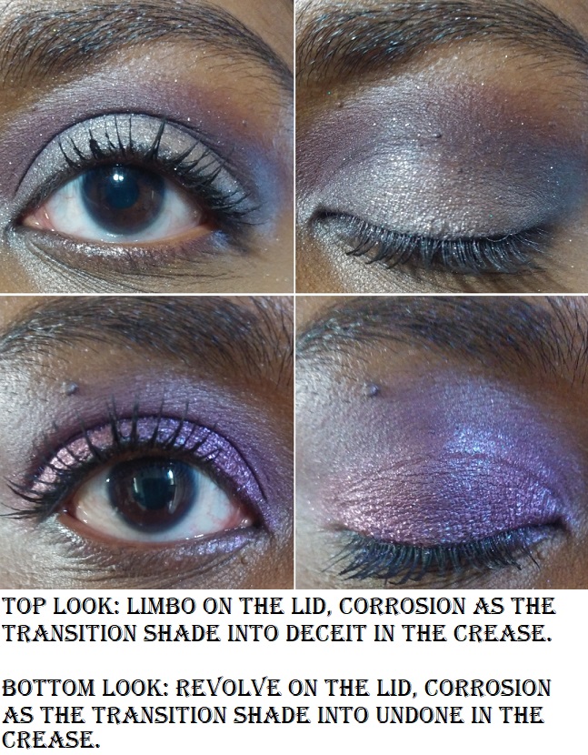 There’s something that seems a little different about the formula of the Velvet Dusk shades (and even the ones from the Afterdark palette), but I can’t put my finger on what it is or how to explain it. They’re still pigmented like the others and long-wearing. Corrosion and Deceit took a bit of work to blend. Deceit specifically is a bit patchy but the sparse areas can be patched up if extra shadow is added on top and not manipulated too much. All of the shadows in this palette stuck to my arm fine in swatches, but these absolutely need a primer in order to stick properly to my eyes. There isn’t anything wrong with needing a primer, but my other Lethal shadows from the older collections still look great without it.
