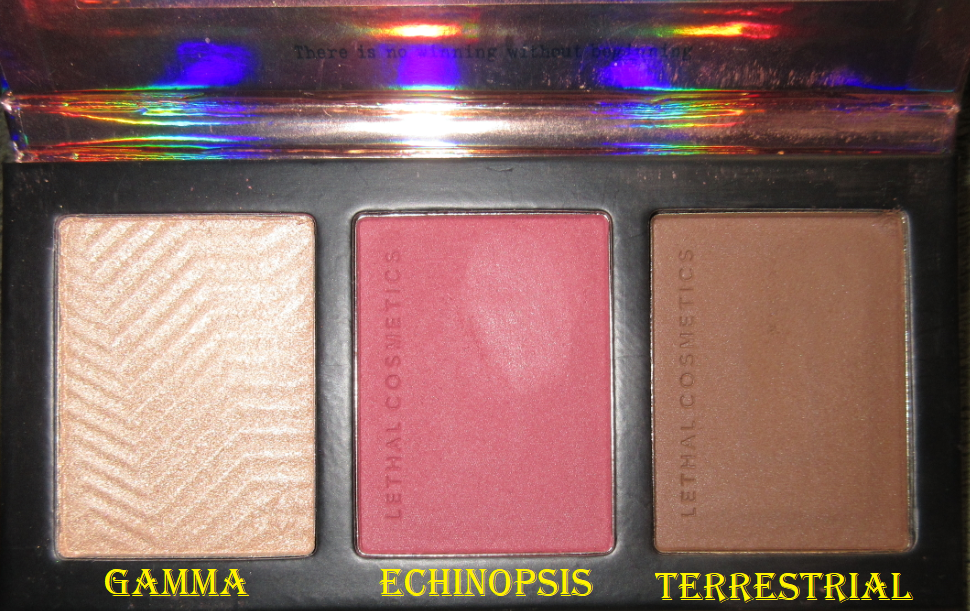This is one of the four premade palettes on Lethal’s website. It was created for those with dark tan/olive to deep skin tones. Lethal Cosmetics has six individual highlighters that have been available long before the bronzers and blushes, but the highlighters in the premade palettes are exclusive to those palettes. The exclusive shade from Solstice is called Gravity and it has a strong yellow base. The blush included is called Echinopsis and the bronzer is Caldera.