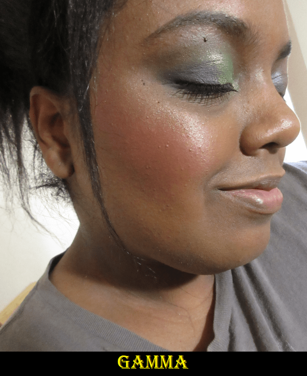 Gamma is an “elegant bronze with warm gold highlights.” It is everything I want in a highlighter! It can be subtle and look more shiny than glittery, but it can also be built up more intensely. I think it’s a better shade match for me as well.