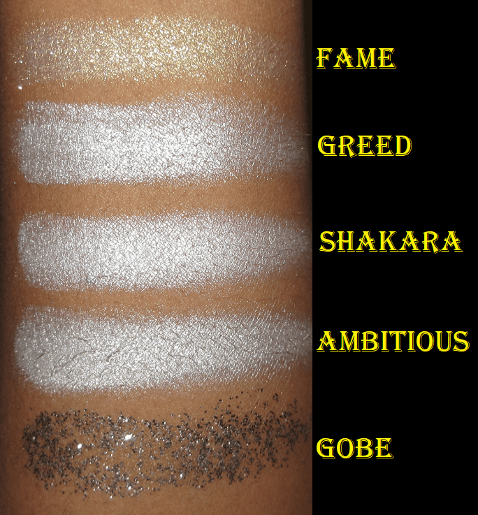 Besides Gobe, I didn’t swatch any other pressed glitter from the Wahala II palette. Unlike the glitters from Nubian Glow and Nubian Royal, which are pressed tightly together in a sandy texture that isn’t too sticky, these glitters have a stickier base that was so incredibly difficult to remove the majority of the glitter specks off my arm. There was no way I was going to deal with that three more times with Goals, 419, and Kolo (which I touched to be sure they were pressed glitters and removing a tiny amount off my finger still proved difficult).