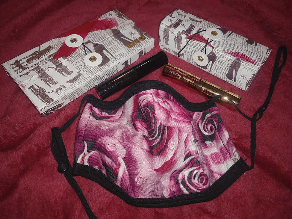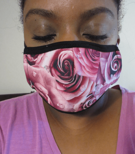 I have better protection masks, but when I saw this on the PMG website, I had to buy it! It’s a 50/50 cotton polyester blend mask with that pretty Divine Rose pattern and adjustable ear loops. It pokes out strangely at the sides when I wear it alone, and it doesn’t look any worse when I wear it on top of a disposable mask.