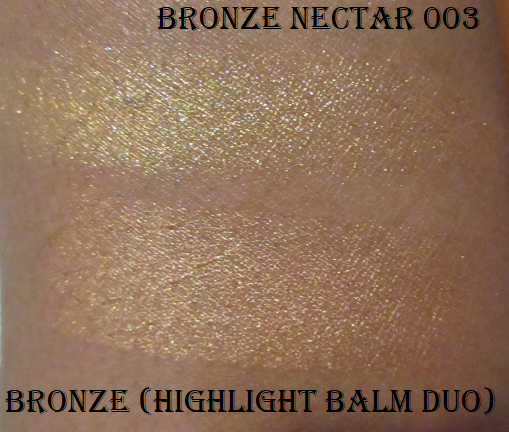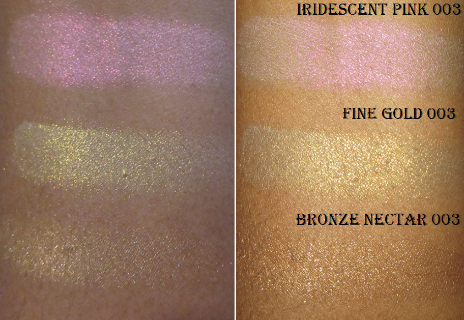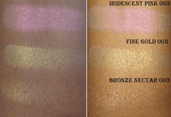 Bronze Nectar on its own is is a traditional highlighter shade, but that doesn’t make it boring. It’s still a very pretty color. I thought I would like Fine Gold 003 more than Iridescent Pink, but the strong yellow shift doesn’t look as great on my skin as I had hoped. It’s still fairly nice, but just my least favorite of the three.
