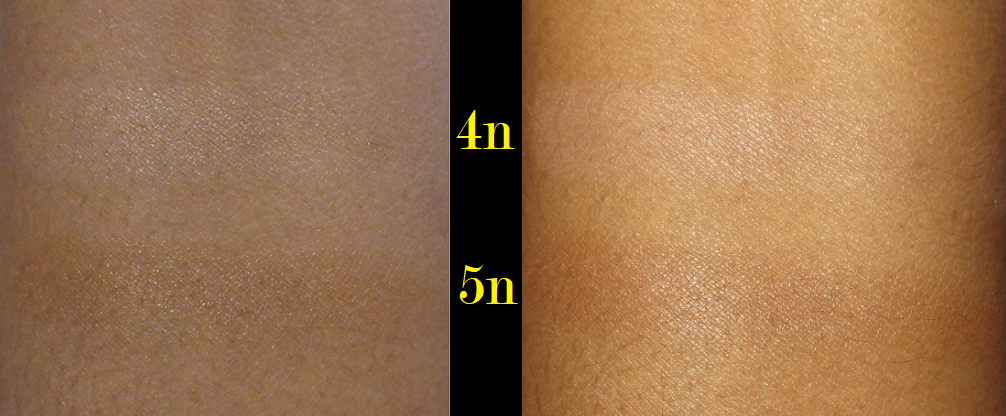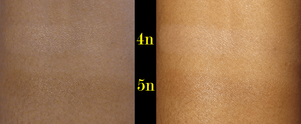 Swatches on top of foundation with flash off (left) and flash on (right).
