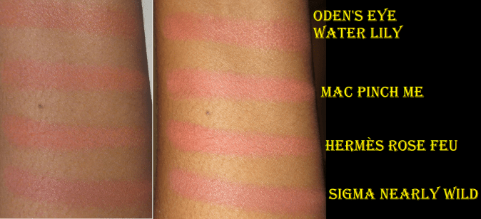 How it looks on bare skin differs from when it’s applied over foundation. While dry, it takes on the rosy-terracotta I mentioned. The closest match I found was MAC’s Pinch Me, which is slightly more coral than Rose Feu. The Nearly Wild blush from the new Sigma Cor-de-Rosa Blush palette is close as well, but slightly too pink. Another somewhat similar shade, but in a shimmer formula, is Water Lily from Oden’s Eye.