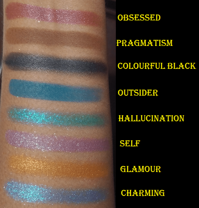 There’s another shade called Green Chameleon in this palette. The website has this listed as an, “Olive green chameleon eyeshadow, multichrome shift,” without describing what what the other colors are. Honestly, I don’t see any shift. The texture of Pink Chameleon is that slick recognizable multichrome texture like Clionadh’s Jewelled formula, Devinah’s Aurorae Flares, the shade called Fake from the Juvia’s Place Wahala 2 palette, etc. Green Chameleon feels like the other four diamond shimmers in the bottom row of the Norn’s palette. The two best ways I’ve been able to detect multichromes is to swatch them on the palm of my hand and rotate my hand around, or to apply them to my fingers and hold them vertically and raise my fingers up and down so that it moves closer then further from the light. All I can see is it going from an olive green to a slightly lighter olive green or a greenish yellow. Its not a difference anyone will notice if you put this on your eyes. It’s still a pretty shade, but I don’t count it as a multichrome or duochrome.