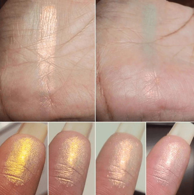 Pink Chameleon is a multichrome! The brand only describes this as having a pink, yellow, and green shift, but I swear it also looks a bit more orange or red or peachy depending on the light and angle. On my finger, this multichrome had clear and obvious shifts. On my eye, this color looked very different depending on which shades I put it next to or on top of. For instance, sometimes it would only pull peachy-pink or yellow-gold, or yellow-pink. In rare occasions I could see pink-green. The green element being the least visible on my skin and especially on camera. I had to do a lot of experimenting with Pink Chameleon to figure out which combos would give me the effect I wanted.