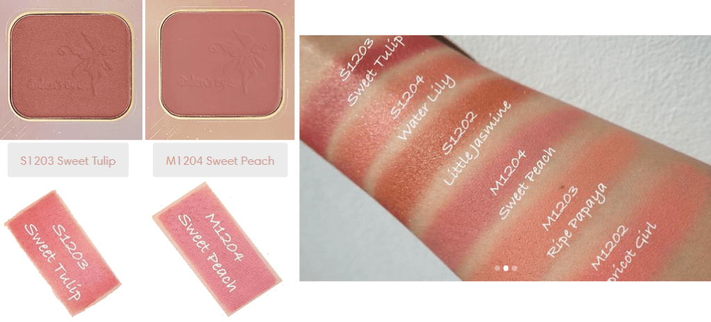 Oden’s Eye currently has three shimmer shades in the Alva Flower Blusher series. Most of the visible glitter specks is on that top layer and they disappears after a few uses. What remains is more of a satin finish with a natural looking sheen. However, the more I try to build up the color, the more radiant and reflective it becomes from the actual shimmer building up on my cheek. So for me, it’s best to stop at a medium amount of blush as building to the maximum payoff results in it looking lighter than before! For example, the shimmer in Sweet Tulip is a bit silvery and looks icier when I’ve packed it on.