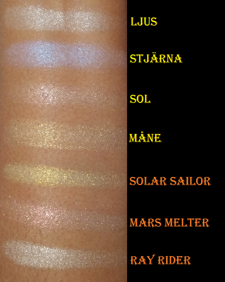 Ljus (light in Swedish) is a pale gold and has the smooth shimmer formula I like, but it’s too icy looking on me. Stjärna (star) is a beautiful iridescent shade that looks white in the pan but is blue with a tinge of purple. These two would make beautiful inner corner eyeshadow highlight shades. Sol (sun) and Måne (moon) remind me of the Kaleidos Space Age Highlighters, but with sparser glitter particles, which is not a feature I like in highlighters. I could use them as eyeshadow toppers, but I don’t know if this palette will survive an end of the year declutter. I’m still happy I received it because my curiosity about the formula would have led me to buy it eventually anyway.