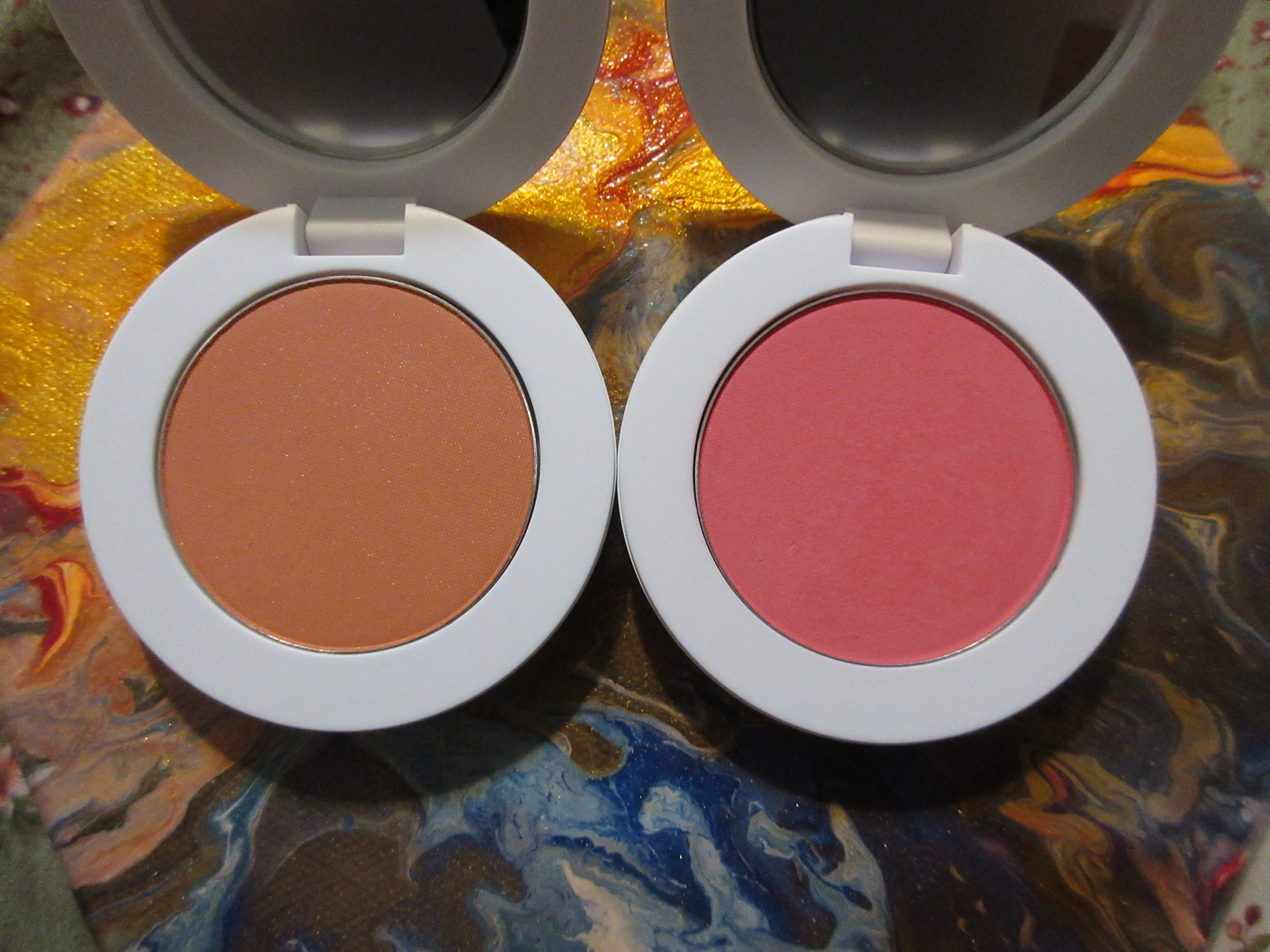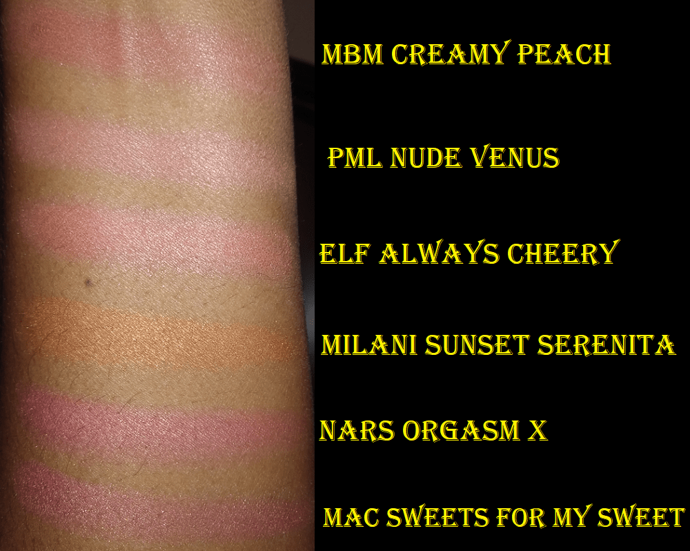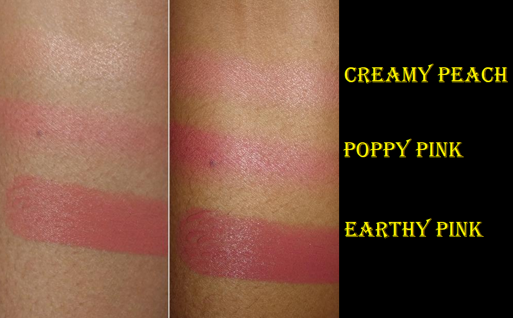 On Sephora’s website, Creamy Peach is listed as a shimmer formula and Poppy Pink as a matte. When I turn the pan in the light, I still see tiny sparkles here and there in Poppy Pink, but that doesn’t translate to the face. It still looks matte (though not dry or flat). As for Creamy Peach, the shimmer particles are easier to see, but it gives the effect of a satin finish. In my previous review on the Pat Mcgrath “shimmer” blush formula, I mentioned that Nude Venus didn’t have as much of a shimmery look on the skin, and Creamy Peach is even less so. I’d consider it a demi-matte. Below are swatches of some shimmer blushes I have in my collection to compare the amount of particles that can be seen.