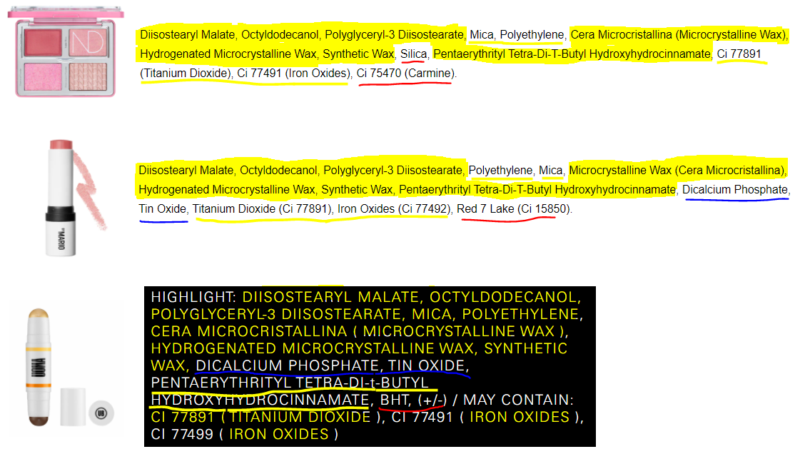 Because I noticed the similarities of ingredients between the cream product in the Makeup by Mario Master Eye Prep and Set to MAC’s Foundation Stick, as well as the Master Metal Manipulator to the Mehron Mixing Liquid, I was curious to see if there were any products that came before which had similarities to the Stick Blush formula. The ingredients that follow the same order are highlighted in yellow. Underlined yellow means they all contain it but in different orders. Underlined red shows the ingredients unique to that formula and underlined blue shows an ingredient shared by two but not all three. The three products are the Glow Cream Base from the Natasha Denona Love Glow Cheek Palette, Makeup by Mario Blush Stick, and the Highlighter end from the Uoma Beauty Double Take Sculpt and Strobe stick. I own a Uoma Stick and can confirm they actually don’t feel the same. The one from Uoma has a bit more slide/glide to it. They have similar griping power on the skin but Mario’s has more of a tacky feel whereas Uoma’s has more slip. I own a different Natasha Denona Cheek Palette and the Cream Base formula for the version I have contains different ingredients, so I don’t know if they are similar or not.