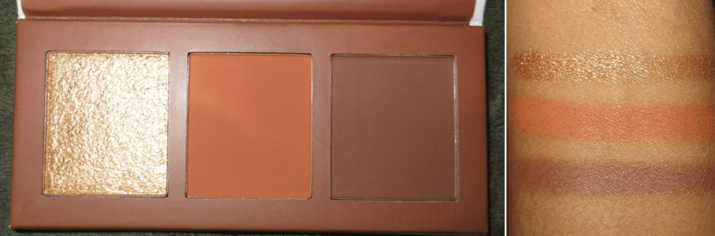 The highlighter is super reflective and the glitter particles are very visible on my cheek, just a bit over the line of being too much for my taste. However, I will continue using it on the eyes because my goodness it’s so pretty! My camera doesn’t even do it justice. I may even transfer this face palette to my eyeshadow collection because all three lasted so well on my eyes without me using a primer of any kind. The dark brown didn’t blend as well on top of the orange, but I think a primer would fix that.