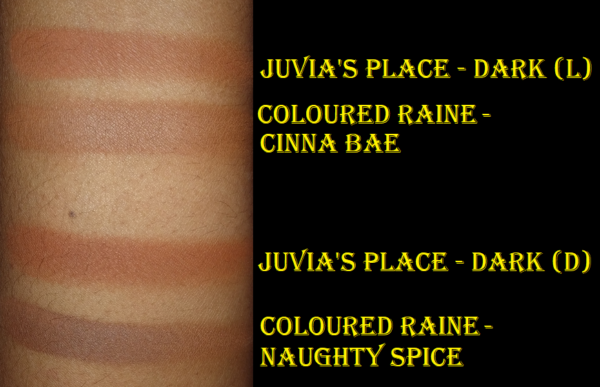 When I first bought this, I was very curious to see how it stacked up to the Coloured Raine bronzers. The Juvia’s Place bronzers feel slightly softer to the touch and are pigmented yet buildable (and perhaps too blendable)! The Coloured Raine bronzers are more pigmented and I think Cinna-Bae is the best shade for me out of the four. Also, besides the differences in tone, I think the Coloured Raine bronzers look a little nicer on the skin. Juvia’s Place gives a better deal at $18 for the duo versus $16 for an individual bronzer, but at least I don’t have to worry about Cinna-Bae coming off until I’m ready to remove my makeup.