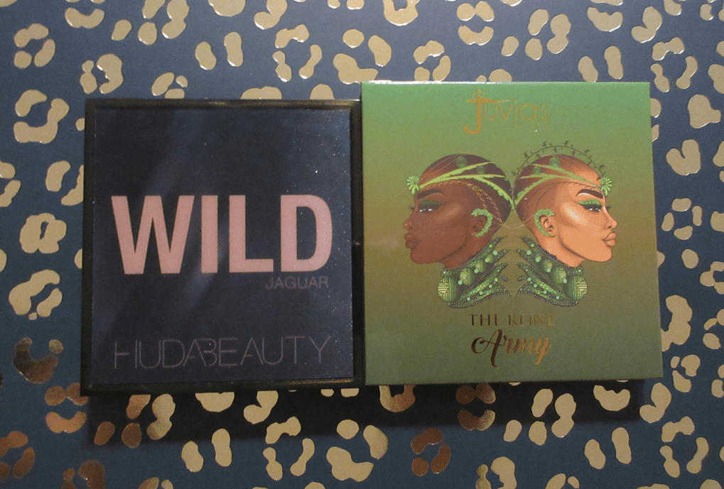 Today’s theme is Danger in the Jungle! It’s a classic man versus nature battle with man being represented by the Army quad from the Juvia’s Place Rebel Collection. The challenger representing nature is the Jaguar palette from Huda Beauty’s Wild Obsessions Collection.