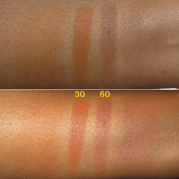 When used on the eyes, I have the same creasing issue. Technically this is worse because of how many layers I have to apply to get it to show up. No matter what I do, the creasing happens within five to ten minutes. Then within an hour it moves, breaks down, and fades in places. With Shade 30, it will last longer in the crease of the eye but not the lid. With Shade 60, it doesn’t last anywhere.
