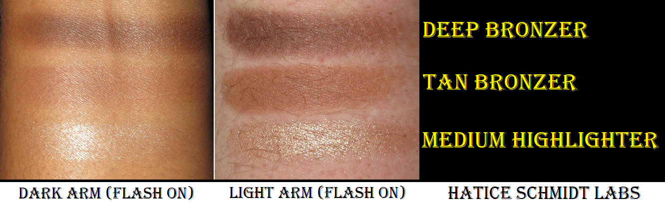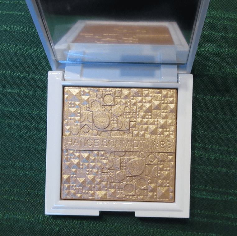 This is a beautiful formula and fans of Hatice Schmidt will likely be very happy with what they have, as well as those who enjoy luxury. The designs in the powder and sleek packaging exude a slightly edgy but high end feel to the products. The only aspect I question is the description as being changeable from subtle to intense. Unless I’m in a spot where the light will hit my face directly, it does not look as variable as that on my skin tone. Whether I use a lot or a little and dry or damp, I find it to be the same middle ground intensity because of the base blending so much in my skin (as if semi-transparent), which is one of the best features of the product. This helps make the highlighter look like a more natural glow, but without a lighter base color, the intensity is dependent on how much it reflects, which means it’s dependent on the lighting someone is in.