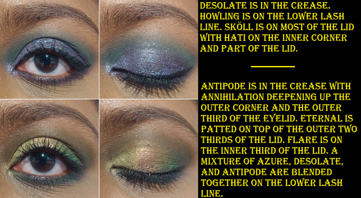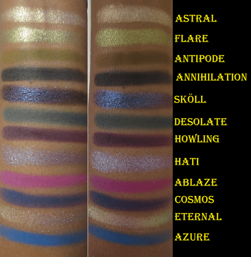 We have three other shimmers and seven mattes. They all perform perfectly and the only noteworthy things I want to mention is that Desolate looks a lot more green in the pan but on my skin it comes off as a green leaning dark teal. The actual shade description according to Oden’s Eye is, “grey…with a slight green tone.” Annette describes it as a “bright dark green” so I feel better about the fact that it’s hard to describe this kind of shade. But as I said, it’s more of a teal on my skin. Astral looks more gold than it does in the pan and Sköll is like a duochrome purple-blue. It’s a black based purple as opposed to the brighter purple of the shade Hummingbird from the Hummingbird palette.