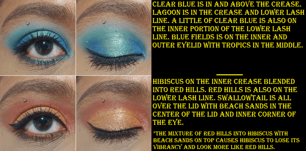 Among the mattes we have Lagoon which is right on the cusp of being a cream to powder, or “cream to matte powder” as Tina describes it in her launch video. It’s just barely creamy enough to be detectable by touch in order to tell it’s more than just a creamy feeling shade. In fact, it reminds me of the satin-like metallics (Realism and Passion) and creamier shades (Obsessed and Colourful Black) from the Oden’s Eye Norn’s Palette. Unlike those shades from the Norn’s Palette, this one has no tugging on the skin and performs just like the other mattes. It’s a dark almost navy blue in the pan and can look that way if packed on, but when Lagoon is spread out, it’s revealed to be more of a deep teal. That’s why I compared it to Queen of Blades in the Club Nebula section rather than Void. Clear Blue is a very thin matte that can be built up to full opacity. It’s not my kind of shade on its own, but it makes a fantastic shade to blend out the edges of a matte. I love pairing it with Star Apple because it makes the edges turn a light violet purple. It also works beautifully with Lagoon. But speaking of Star Apple, that’s my one troublesome shade from the palette. All the other shades are easy to apply and blend, but Star Apple takes significantly longer to get an even color. At first I thought it was because it’s a patchier shade, but then I realized that whatever red-raspberry tone was used to create this purple actually peeks through. It’s visible in the edges of the swatches as well. When I take photos, the red that shows through makes it look unblended, even though it’s completely opaque in person. So in order to make it look nice for the camera, I actually take a tiny bit of Lagoon and blend it in. The blue from Lagoon mixed with the red spots in Star Apple turns it purple without changing the overall color. As much as I love the concept of the shade and how perfectly it captures the color of the actual fruit, it makes the most sense to just use it paired with the other pink and red shades in this palette. If I want to pair it with blues, I need Lagoon with it. Red Hills is a beautiful dark red that when applied in a thin layer shows a lovely warm orange hue it has to it. Hibiscus is the last matte and it’s a stunning vibrant deep-pink red shade. It’s difficult to describe and I don’t have a shade like this in my collection, which is a pretty big feat. The closest thing I have to it are some of the neon mattes from Terra Moons and Splash from the Coloured Raine Vivid Pigments. With Hibiscus, using the right primer will ensure it stays vibrant on the eyes. There are a few times I had issues of it deepening up.