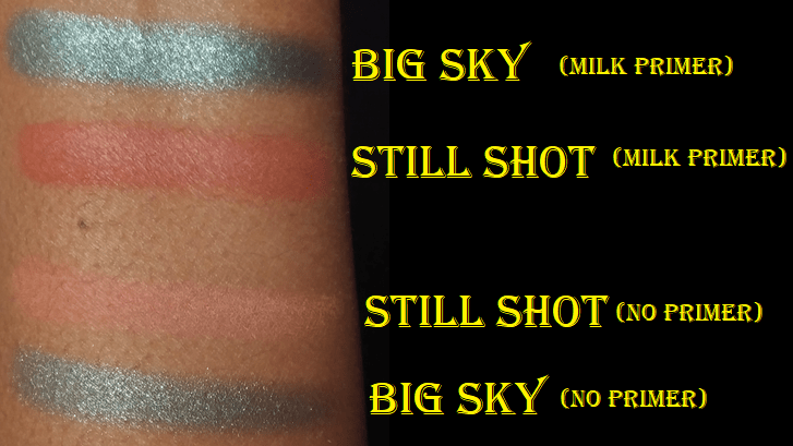 If I follow the instructions and do those steps above, in the best case scenario the shadows will grip to the primer and appear very intensely on the eyes. However, it grips so well that I cannot blend them out! So, if I’m going to use this on my eyes, I keep it concentrated to just the eyelid where I want my shimmer to stick. I haven’t tried this primer with that many different eyeshadow formulas, but in this demonstration using the Urban Decay Born to Run Palette, the primer did intensify the shimmers and mattes, but the matte shade darkened up a lot. The primer itself is clear, so the wet consistency caused this to happen, which some people will not like. I’m not sure if I like that aspect myself. Perhaps this doesn’t happen if I use even less product, but either way, I don’t like that I can’t blend the shadows, so I didn’t continue to try testing it.