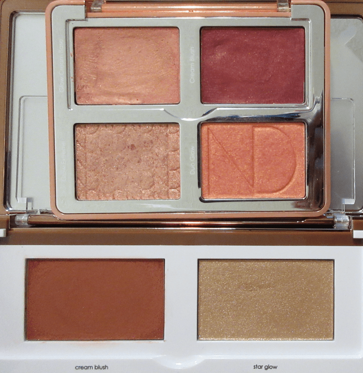 The plastic flap covers the blush and highlighter, so it’s natural to assume both are cream products, but it’s just the blush that has a creamy texture. The highlighter is a pressed powder in a formula that’s new to Natasha Denona’s brand, “that uses Japanese technology to deliver an extreme glow.” The way it looks in the pan with that texture instantly reminded me of the highlighter from Beauty Bakerie’s Brownie Bar.
