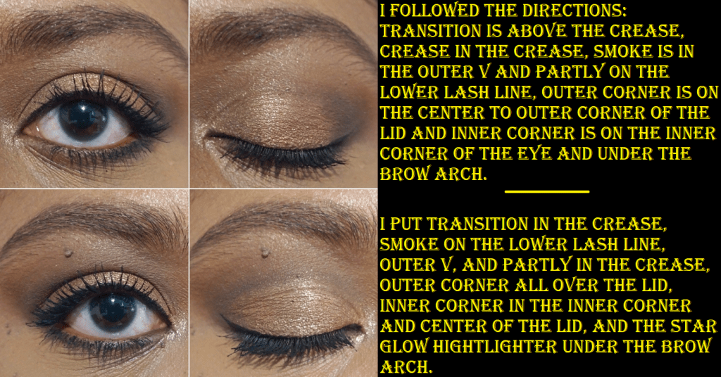 As for the eyeshadows, I first tried following the guide based on their names. Because Transition and Crease are so close in depth with Transition being orange-brown and Crease being the slightest bit darker but red-brown, it was hard to see the distinction between them on my eyes, especially after adding Smoke. They just blended together without much of a gradient effect. I’m used to using transition and crease shades that are a little further apart in depth, so it took several tries to get used to having to be so careful where I place the shadows and how I blend where my eyes are partially hooded.