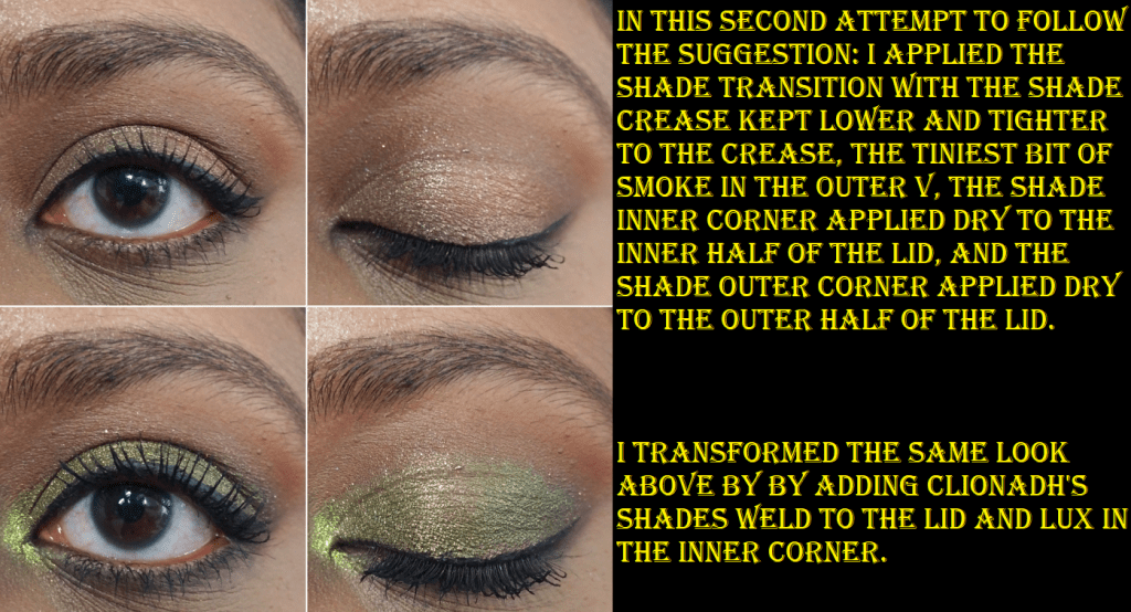 The shimmers aren’t very intense unless they’re applied with a damp brush. Using my finger somewhat works for Inner Corner, but the shimmer from Outer Corner doesn’t stand out much without being foiled. Even if applied wet, I was still expecting something more sparkly like the shadows in the Lorac Noir palette. In order to create that effect, I have to pop Inner Corner on the center of the eyelid.