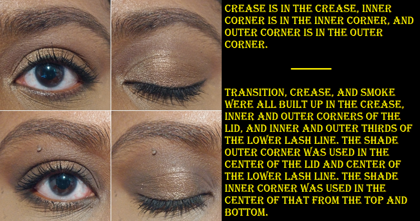 As for the eyeshadows, I first tried following the guide based on their names. Because Transition and Crease are so close in depth with Transition being orange-brown and Crease being the slightest bit darker but red-brown, it was hard to see the distinction between them on my eyes, especially after adding Smoke. They just blended together without much of a gradient effect. I’m used to using transition and crease shades that are a little further apart in depth, so it took several tries to get used to having to be so careful where I place the shadows and how I blend where my eyes are partially hooded.
