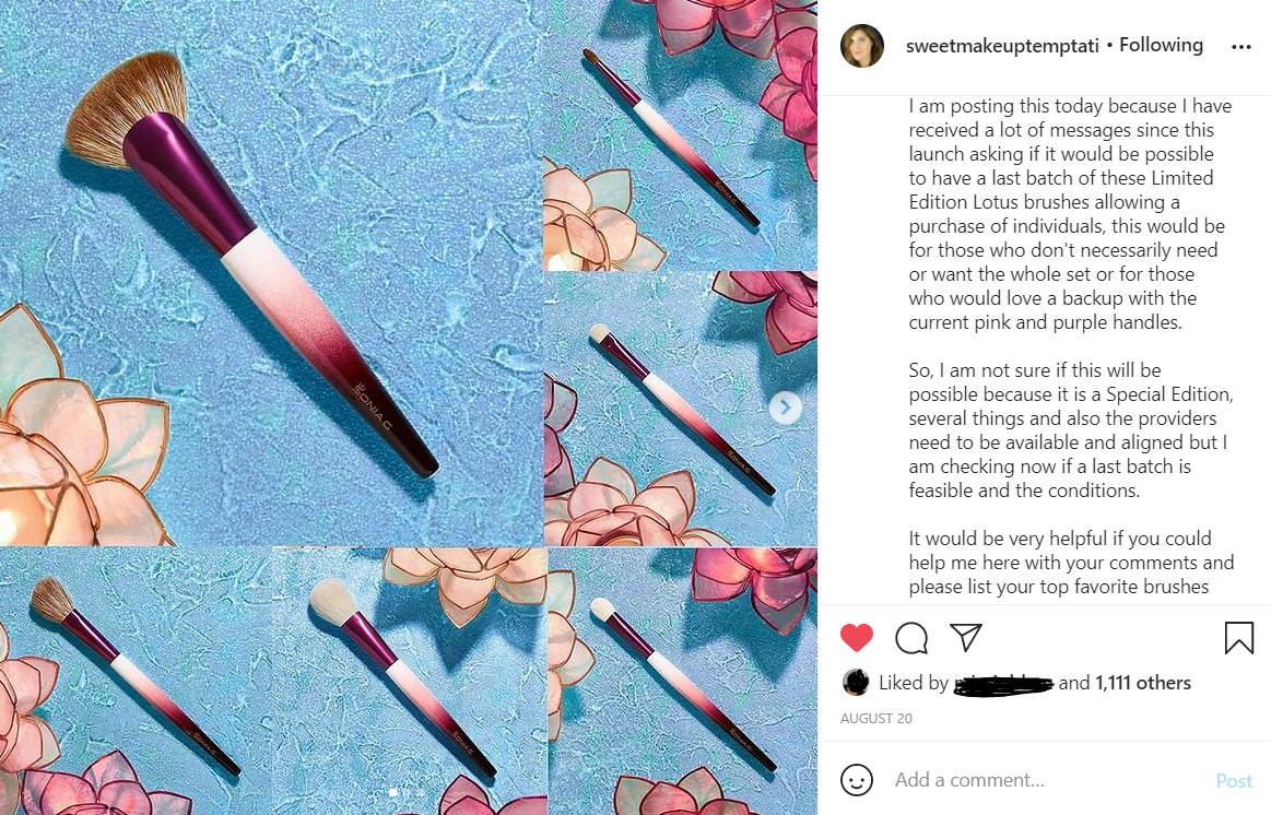 I had to get creative in order to have the brushes I wanted from this series. It was stated repeatedly by Sonia herself that the Lotus series would only be available as a full set. I couldn’t afford that expensive of a purchase, so I sold the brushes I didn’t think I would get as much use from in order to help pay for the brushes I was keeping. However, I can’t say I was shocked by the switch from the initial, “It’s not possible to sell this individually,” statement on Sonia’s blog on July 11th to the, “I’ll have to see if we can,” on August 20th on her Instagram.