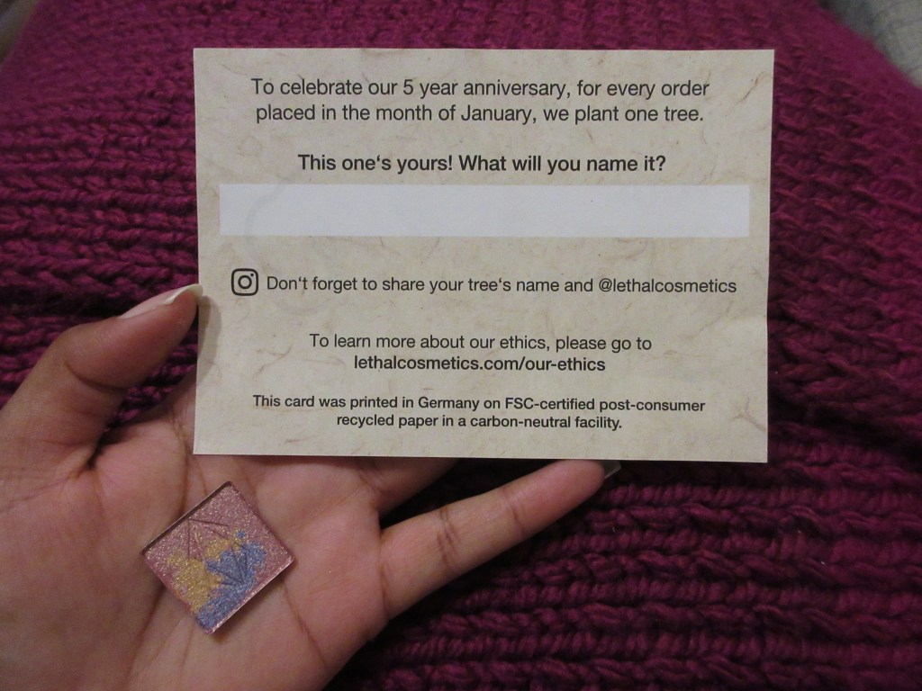 This is one of four limited edition charity eyeshadows released from Lethal Cosmetics. I mentioned liking tigers earlier in this post, but I am dog person and I have a soft spot for pitbulls. It was very lucky that the only eyeshadow that caught my attention happened to be the one named after the sweet rescue pitbull named Meekha. In addition to the animal charities being supported by the purchase, Lethal also committed to planting a tree for each January order. My sister had a pitbull named Radja, so that’s the name I chose for the planted tree in her memory.