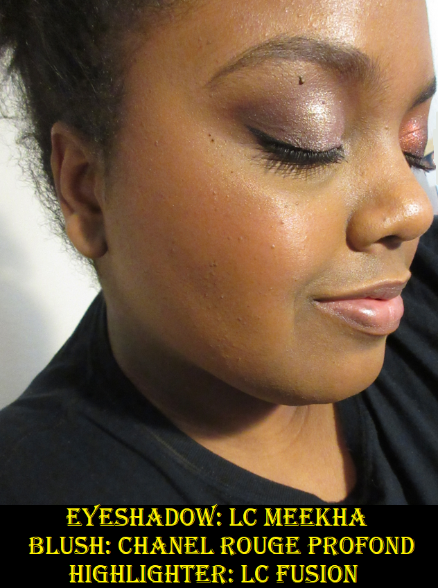Unlike Gamma and Gravity, my two other Lethal Cosmetics highlighters, I find Fusion to be quite subtle. Fusion is close to my skin tone, and that could add to how subtle it is, but even the texture feels a bit different than the other two, and not just because of the lack of ridges. Fusion was difficult to show in swatches, even when built up. It feels a bit hard pressed*, and when the highlighter was delivered, it was messy around the pan edges as well as within the packaging. My brushes are able to grab product easily (despite the fact that it looks a bit hard-panned** now too) but perhaps the hard pressing is preventing more of the actual shimmer particles from being picked up. That would be ironic considering if I have an issue with a highlighter it’s usually that my brush is picking up too much of the shimmer.