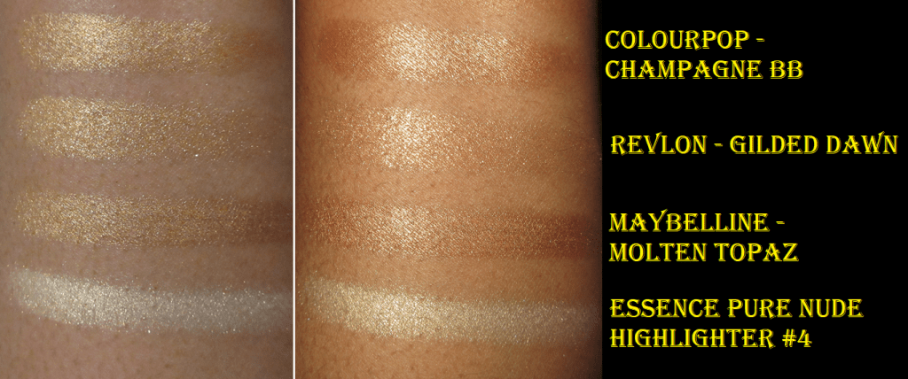 I thought it might be interesting to compare some of my least expensive highlighters together in the picture below. I like Colourpop the most, then Maybelline, Revlon, and Essence.