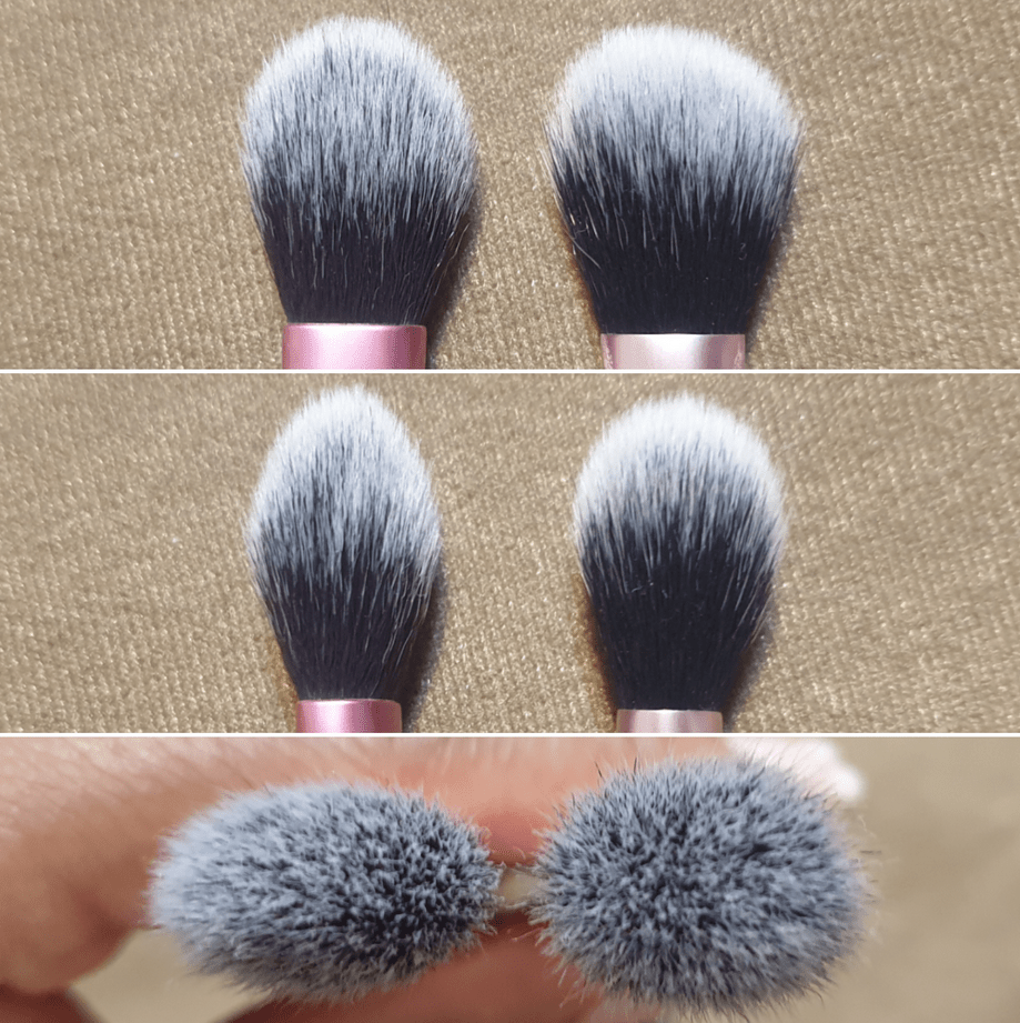 The original brush has wavier bristles and is narrower than the new version of the blush brush. I expected to find major differences in the performances of these brushes, but the end result of each brush looks exactly the same. The only difference is the new one is softer, so the new blush brush also wins.
