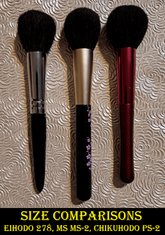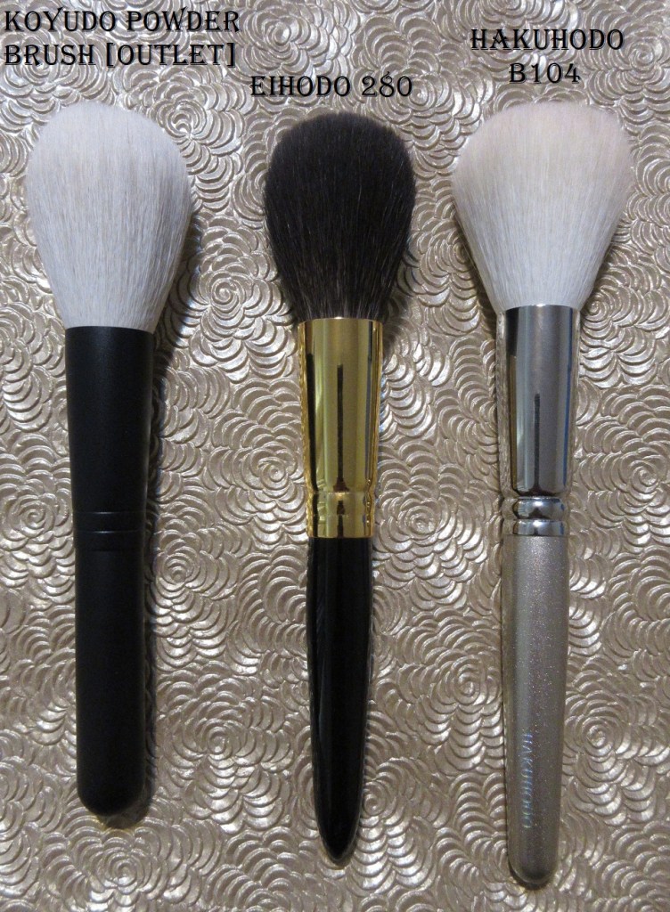 Comparing other round brushes I own that are wider at the tips than they are at the base, the closest I have in size to the Eihodo 280 is my Koyudo Saikoho Powder Brush (another outlet brush) and Hakuhodo B104. The B104 is in the long handle version, which makes this brush a comparable length to the Eihodo, although the brush head is bigger. The Koyudo brush is a lot closer, but still bigger. I thought it might be a good comparison though because I suspect the Koyudo brush is similar to the rephr 30, (though I don’t have it to confirm it).