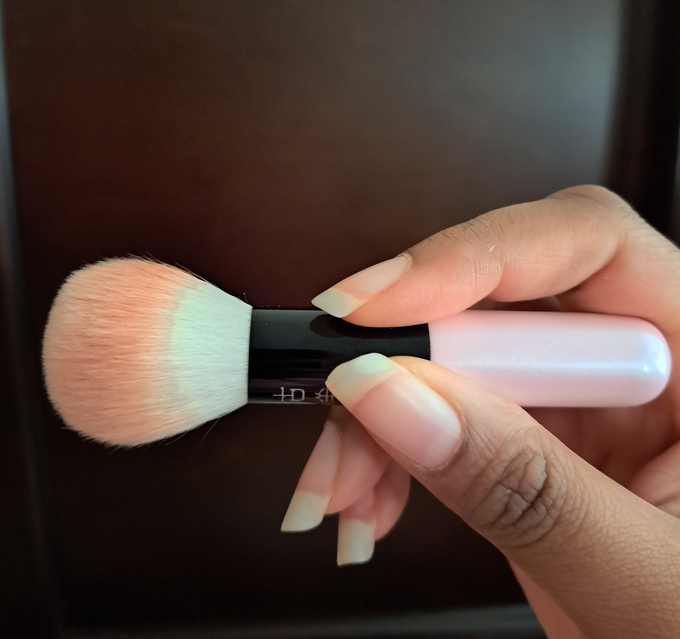 This brush isn’t bundled tightly, so it looks fuller than it is. When I lightly push both ends of the hair together to see how much is actually there, it’s only 5mm thick. It’s very floppy and is difficult to pick up my pressed powder products, except the ones that are very loosely pressed. That lack of denseness also means I can only sweep the product on since the hair isn’t resilient enough for proper buffing.