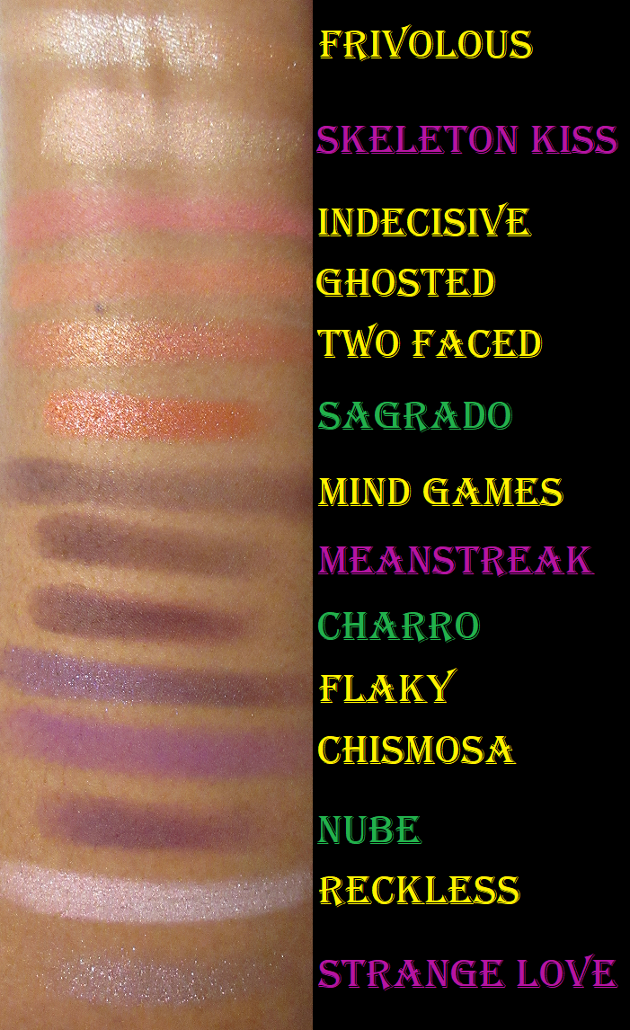 None of them have true dupes, but since Mind Games is the kind of shade I’d only use in the outer corner, the tone differences between that one and the two other dark purples would be indistinguishable on my eyes. Two Faced and Sagrado are clearly different, but still close enough in my book. Also, what keeps Frivolous and Skeleton Kiss looking so different is that Skeleton Kiss is an iridescent shadow, so despite it looking pale in the pan, it has a stronger pink color to it when swatched. If anything, Reckless and Skeleton Kiss have more in common since Reckless is another iridescent shade, but in a pink-lilac tone. Other than those few shadows, I feel I can still justify buying this palette and don’t view it as duping my own Melt Collection.