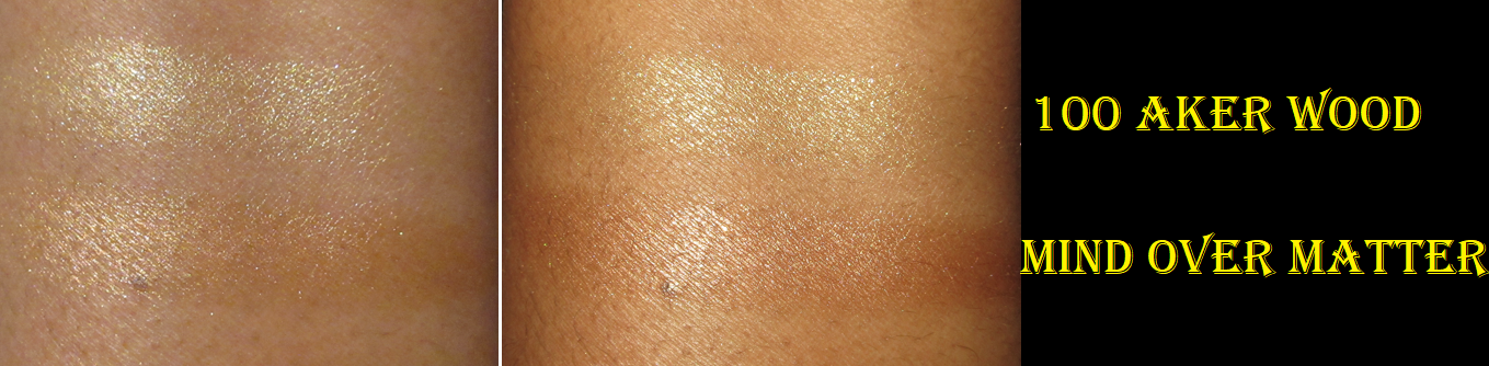I applied a light amount of 100 Aker Wood below. As for Mind Over Matter, the tone matches me really well to the point that I had to build it up in the demonstration photo below in order for it to be seen on my cheeks. Adding more also emphasized the amount of glitter specks that can be seen. The extra sparkles aren’t so much to stop me from wanting to use this highlighter though. I have only worn these over natural and dewy foundations. I can attest to these melting better into my skin the dewier my face is.