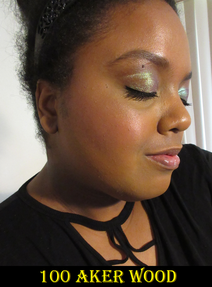 For times that aren’t Halloween, I learned that when I want something unique yet wearable, I just need to put on a deeper highlighter (like Colourpop’s Mind Over Matter) and add Find the Book on top of it. This combination does change the color a bit. Green is still present, but the bronze-orange tone in Mind Over Matter mixed with Find the Book really intensifies the gold. I decided to show that very example in the two photos below. They have been cropped to just show the cheekbone highlight because the day I took the pictures was intended to just be an eyeshadow palette testing day when I often just put makeup around my eyes and leave everything else alone. On this particular day, I skipped foundation and did not conceal the hyperpigmentation around my mouth, so I didn’t feel comfortable showing a full face.