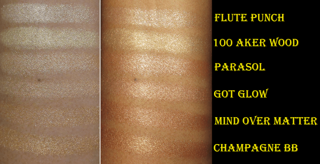 Flute Punch is too light for me but I bought it to mix with Champagne BB. Champagne BB on its own is slightly too dark for my face. Mind Over Matter is close to that one in depth, but just slightly lighter and closer to matching the brown tones in my face. Parasol and Got Glow are still the best ones I have for highlighting purposes, but Got Glow is better because it’s the tiniest bit more golden and darker. The shimmer particles in Parasol are lighter than Got Glow, so Parasol can look too light from the shimmer reflecting more harshly in contrast to my skin tone at certain times of the year. The downside to Got Glow is the mix of multiple colors in the pot that doesn’t always look as complimentary depending on how much of the darker or lighter colors get picked up and applied.