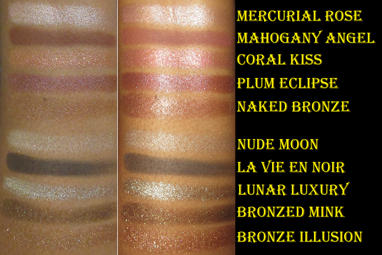 Binary Sunset is a little drier than the other shimmers whereas Cyborg Relations has extra slip to it, like Bronze Mink from Bronze Bliss. This palette isn’t as inspiring as Nude Allure or Bronze Bliss for me, but it has some great staple warm toned neutral options that will continue to benefit me as I use these palettes together.