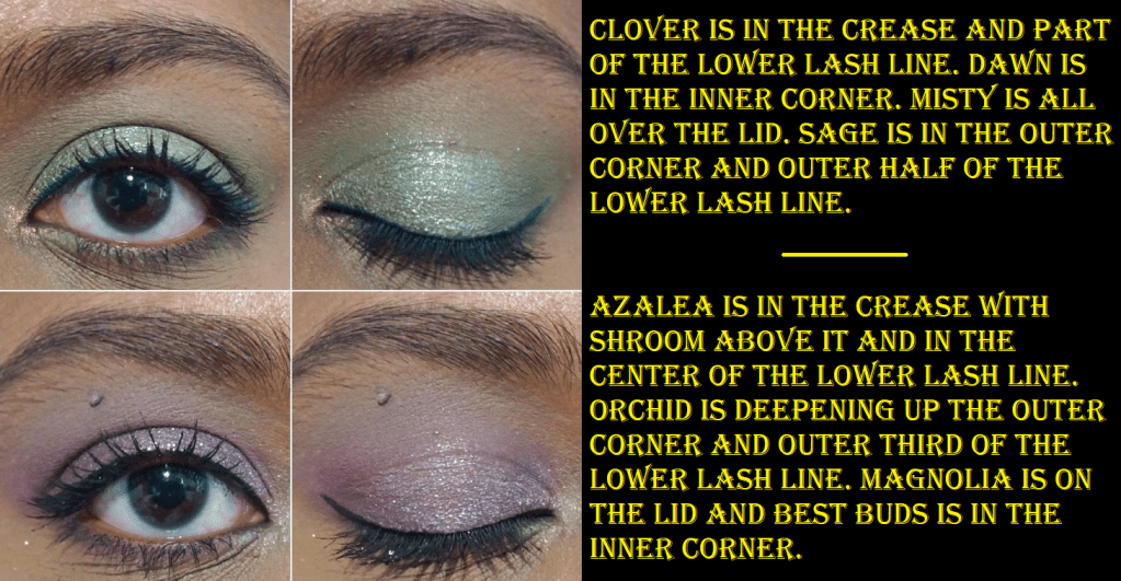 These mattes are mostly easy to use, but they feel slightly thinner than I’m used to from the brand. They still give decent color payoff despite being soft muted colors, with the exception of Sage that ended up looking quite similar to Clover on my eyes, even though they look completely different in swatches. The issue is that I had a harder time building up Sage to something deep enough for my outer corner. Without being able to build it up more opaquely, there wasn’t as much distinction from Clover which was used first. Perhaps I would have gotten more color payoff if I used Sage first.
